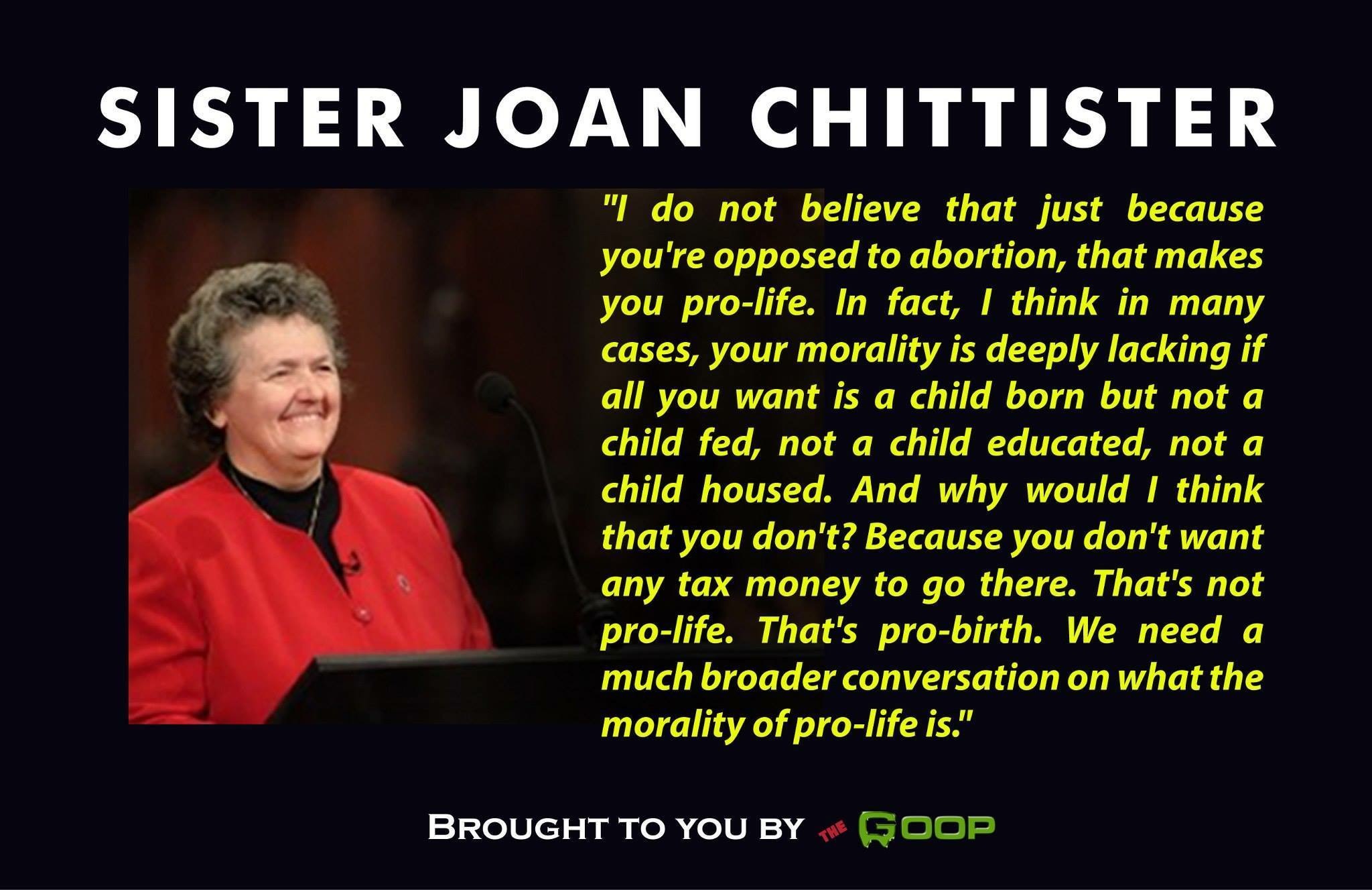 In the picture above, this nun says that if one doesn’t believe that the government should take care of children from cradle to grave, then one isn’t truly pro-life. Instead, if one is merely against abortion—and not for cradle-to-grave governmental care—then one is merely pro-birth. In the block quote above, the argument is this: If you don’t vote to use tax dollars to help the poor, the sick, and the needy (along with preventing violence and taking care of prisoners), you don’t want a government based on Christian values.